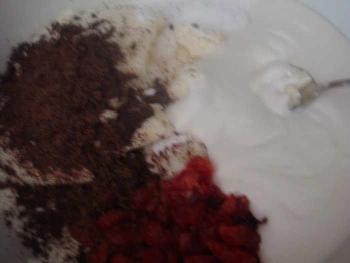 В сырную массу добавить взбитые сливки ,вишню, шоколад. Хорошо все перемешать.