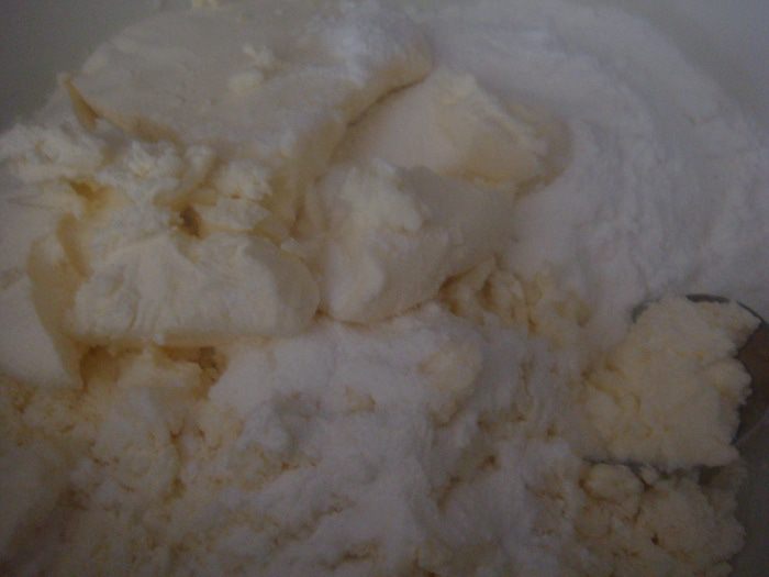 Перемешать маскарпоне, рикотту, сахарную пудру и ванилин.