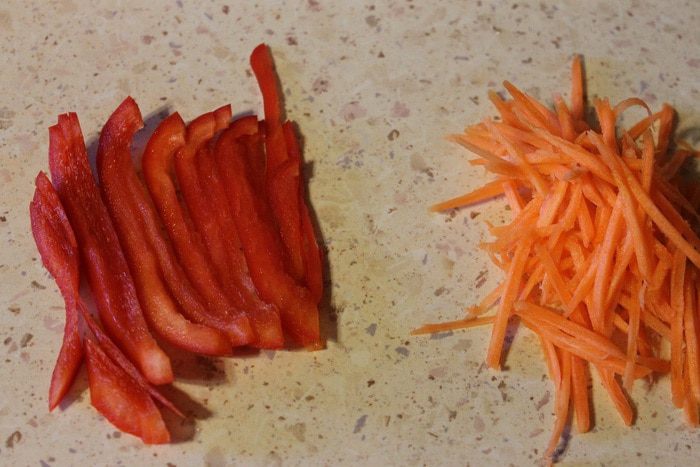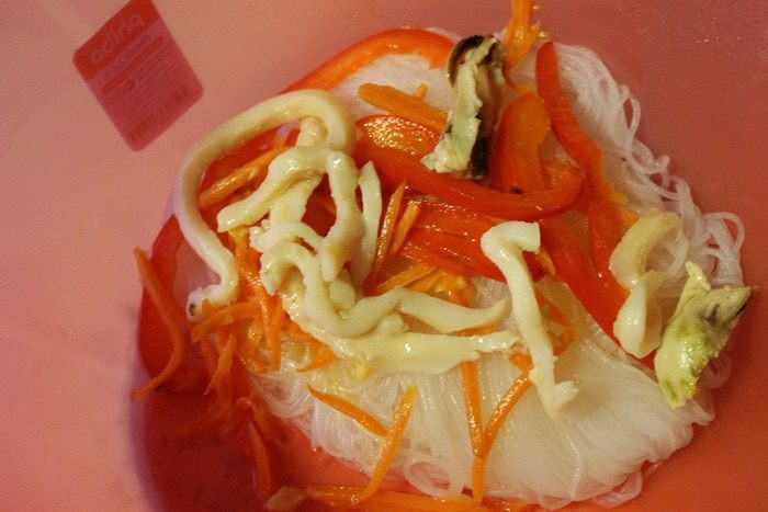 Перец нарезать тонкой соломкой, морковь натереть на терке для корейской моркови. Разогреть масло и обжарить овощи на сильном огне, буквально минуту. Выключить огонь и добавить морепродукты, перемешать.