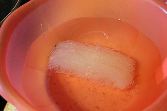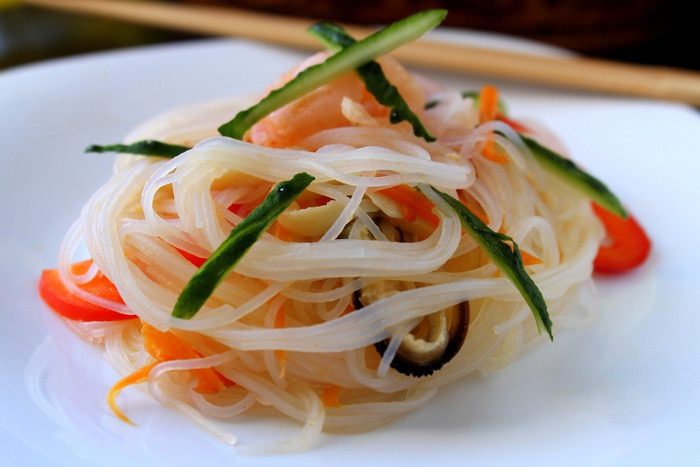 Фунчозу откинуть на дуршлаг, дать воде стечь и сложить в салатник, туда же добавить обжаренные овощи и морепродукты. Аккуратно все вместе перемешать.