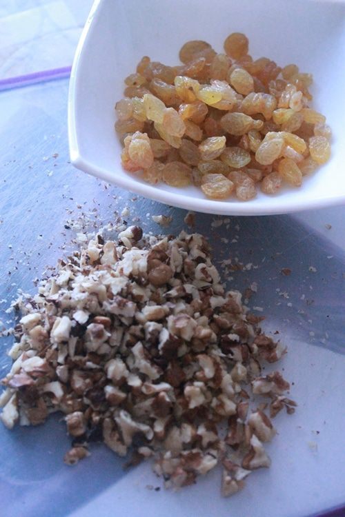 Духовку разогреть до 175 градусов. Изюм замочить в горячей воде. Цукаты мелко порезать.