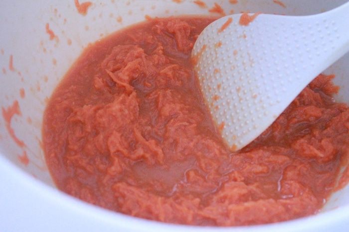 Морковь натереть на мелкой терке. К моркови добавить сироп, кокосовое молоко, масло, экстракт ванили, яблочный уксус и цедру апельсина.