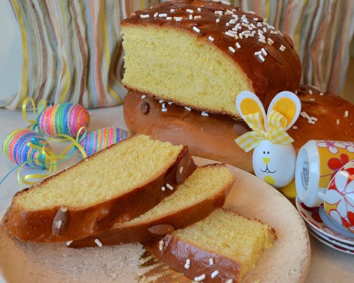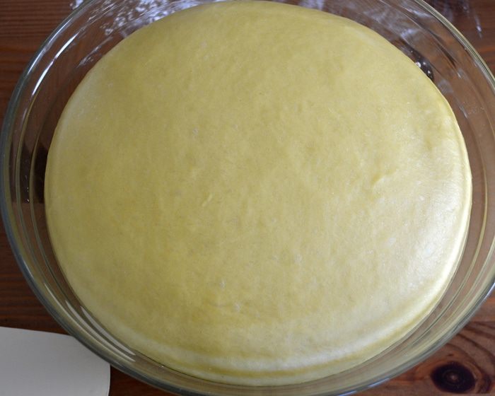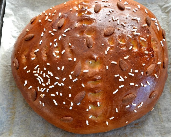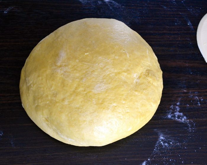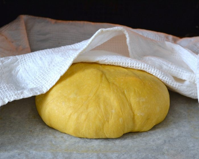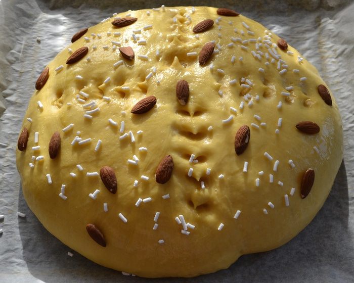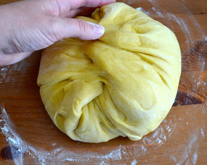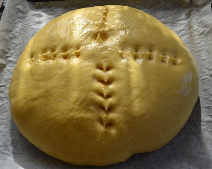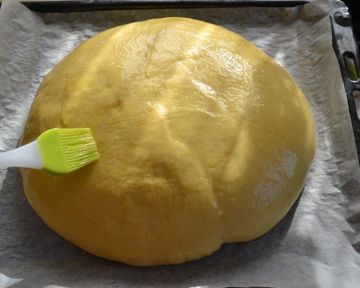 Можно замесить тесто вручную, а можно с помощью кухонного процессора (тестомешалки). В опару добавить ПО ОДНОМУ 3 яйца и 1 желток (белок нам понадобится для смазывания каравая перед выпечкой). Добавить оставшийся сахар, щепотку соли, ром (я не добавляла), ванилин и мелко натертую цедру лимона и апельсина. Продолжая замешивать, добавить поочередно просеянную муку и растопленное сливочное масло. Если вы замешиваете тесто вручную, то на этом этапе выложить тесто на припыленную мукой поверхность и месить тесто несколько минут на столе.