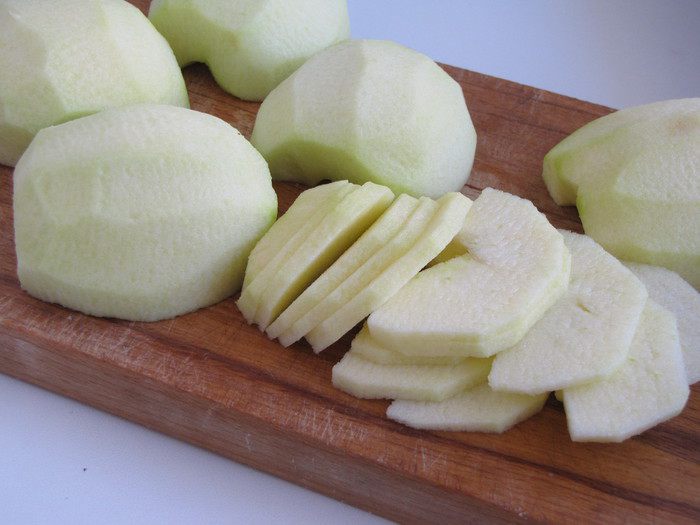 Яблоки очистить от кожуры и нарезать тонкими ломтиками.