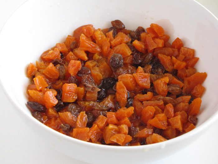Курагу нарезать небольшим кубиком, смешать с изюмом и залить 30 мл. коньяка. Вместо коньяка можно взять ликер.