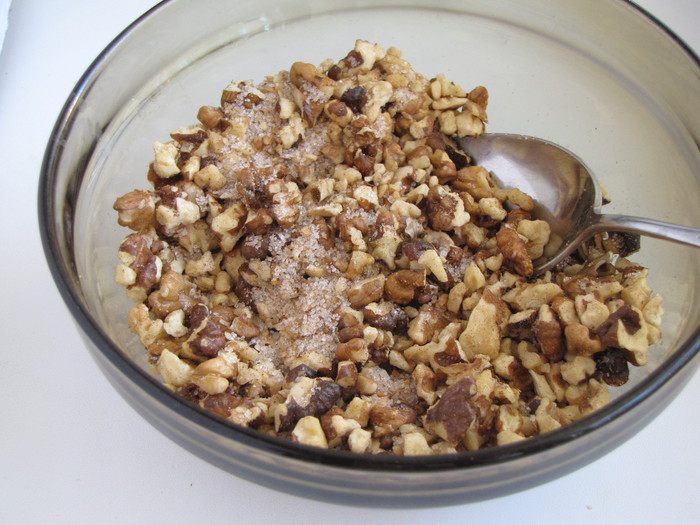 Орехи перемешать с сахаром и корицей.