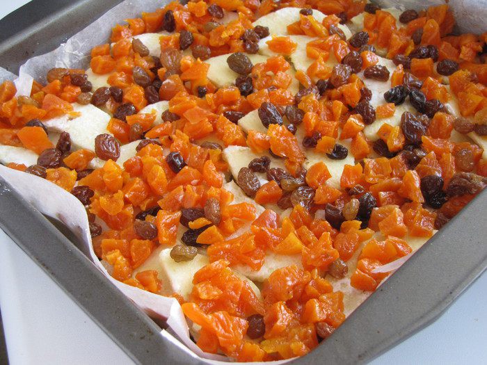 Сверху разложить изюм и курагу.