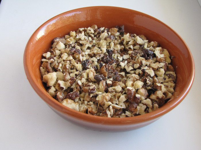 Орехи слегка поджарить, порезать ножом не слишком мелко.