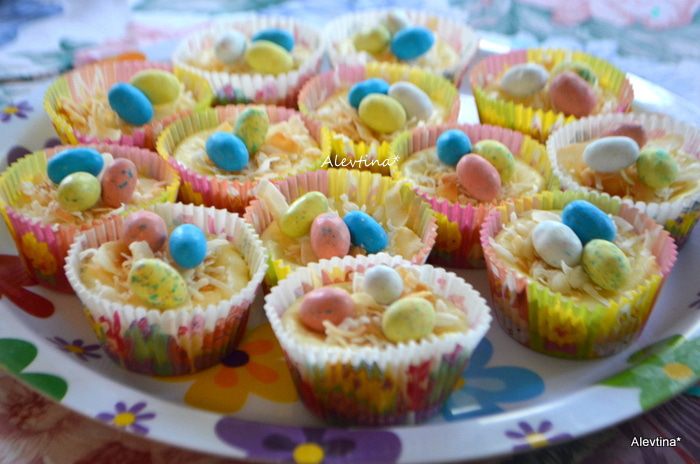 Распределить по всем мини чизкейкам подсушенную кокосовую стружку, украсить мини яйцами пасхальными.