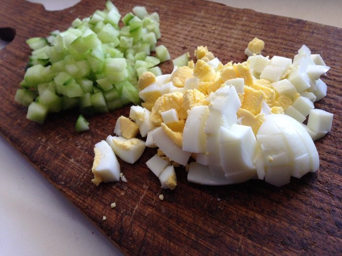 Яйца сварить, очистить и мелко нарезать. Также мелко нарезать огурец (если маленькие, то 2-3шт, у меня был большой).