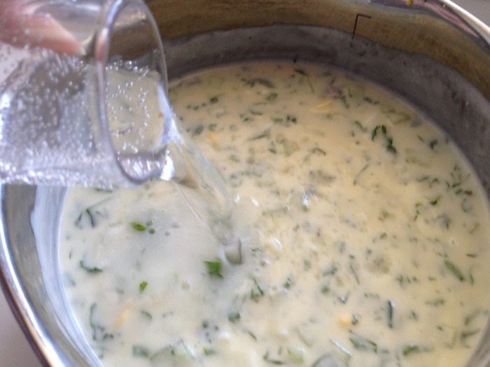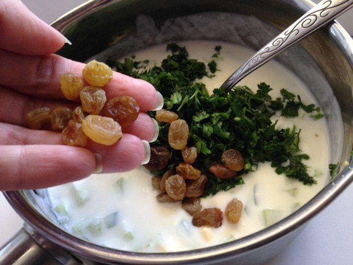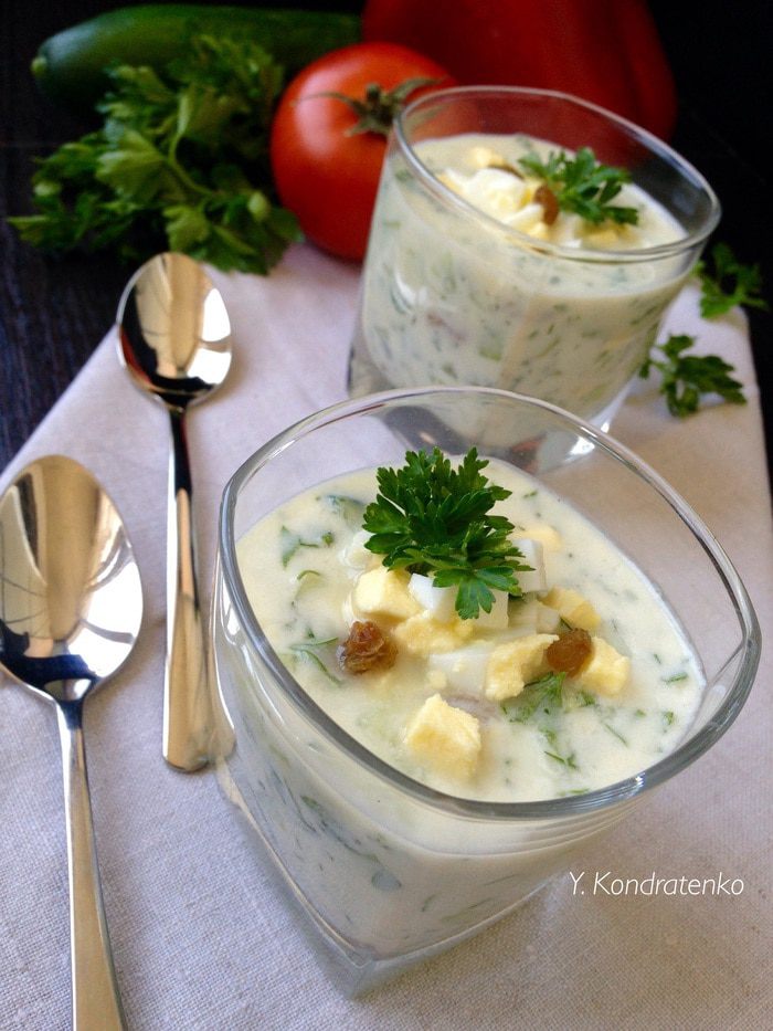 Очень легкий и освежающий супчик, что-то среднее между окрошкой и таратором. Пикантности ему придает изюм, который здорово сочетается с йогуртом и овощами.