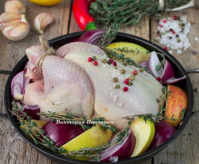 Яблоки, красный лук и вторую половину лимона нарезать дольками. Выложить в порционные сковородки, немного посолить, сверху выложить цыплят. Посыпать целым розовым перцем, выложить веточки тимьяна. В одну порцию я добавила пропущенный через пресс чеснок, в другую положила 1/2 головки чеснока, разрезанной поперек зубков.