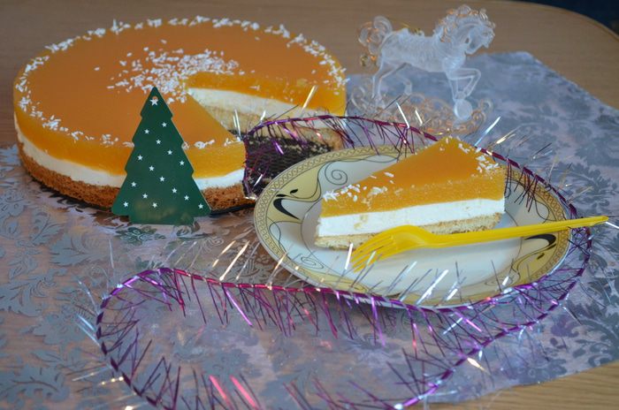 Берём зрелую, жёлто-оранжевую тыкву, моем, выскабливаем мякоть, освобождаем от семечек. Пюрируем мякоть блендером, добавляем сахарный песок 130 гр. и ставим варить до растворения песка, вливаем сок, вводим желатин (24 гр.), предварительно замоченный в воде (4 ст. л.) и распущенный на водяной бане. Остужаем и выливаем тыквенное пюре на корж песочно-творожный, ставим в холод на ночь. Так будет надёжней, а утром - нате Вам, пожалуйста!