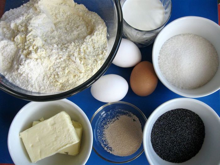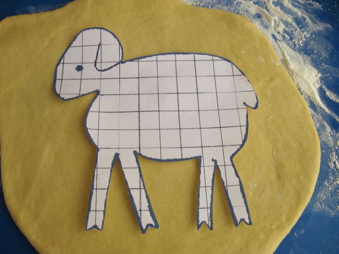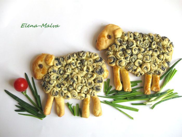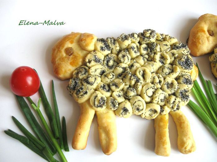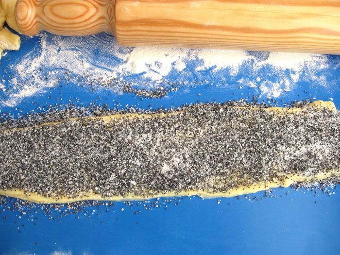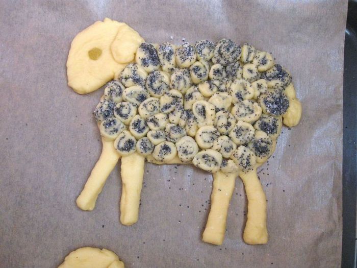 Оставшегося теста хватит и на маленькие рулетики для оформления барашков, и на большой рулет. Часть оставшегося теста раскатать в тонкую, не очень широкую, длинную полоску, слегка смочить ее водой и посыпать слоем мака, смешанного с сахаром. Свернуть в плотный рулет диаметром примерно 1,5 - 2 см. Рулет разрезать на кружочки толщиной 1–1,5 см.