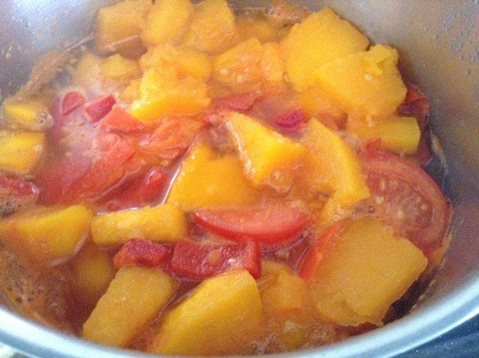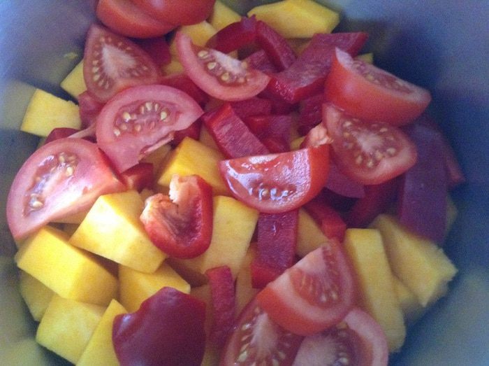Перец и помидоры нарезать, переложить в кастрюлю, добавить тыкву.