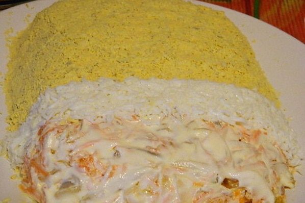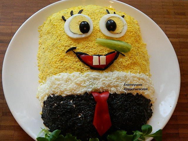 Штанишки я сделала из оливок, натертых на мелкой терке. Глаза - яйца, рот ресницы и зрачки также оливки. Рот и галстук - болгарский перец.