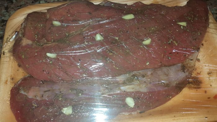 Вот тут я упустила важный момент. Нужно было быстро обжарить мясо со всех сторон до румяной корочки, а уже потом закладывать в рукав, я замоталась и забыла это сделать... Ну ничего.