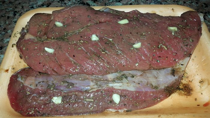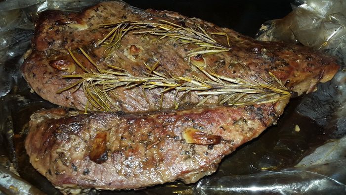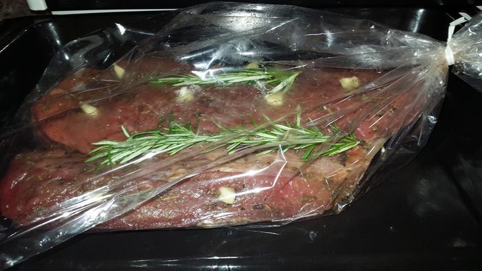 Выкладываем мясо в рукав для запекания, добавляя веточки розмарина, закрываем его, прокалываем в паре мест для выхода пара зубочисткой, выкладываем на противень и отправляем в разогретую до 180 градусов духовку на 1 час 20 минут.
