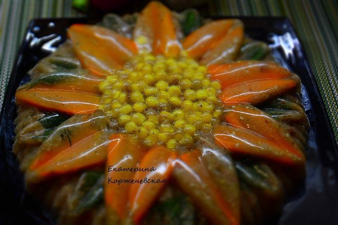 Так вот все прошло как по маслу :) Но здесь нужно аккуратно, с ювелирной точностью уложить кукурузу и вырезать морковь для лепестков. Про это расскажу по порядку :)