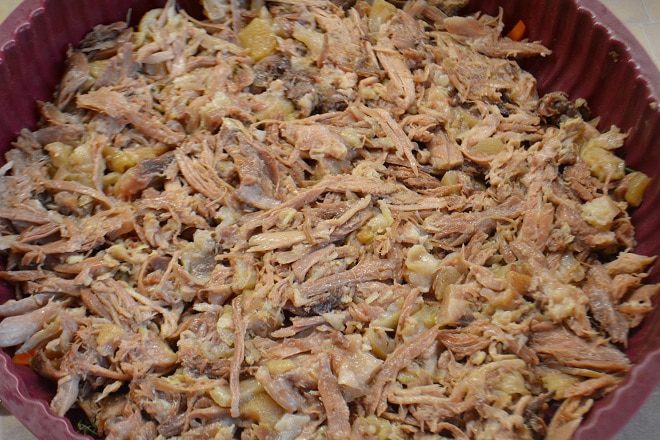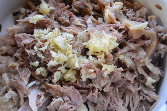 Мясо разобрать на волокна и добавить чеснок через пресс и свежемолотый черный перец, перемешать.