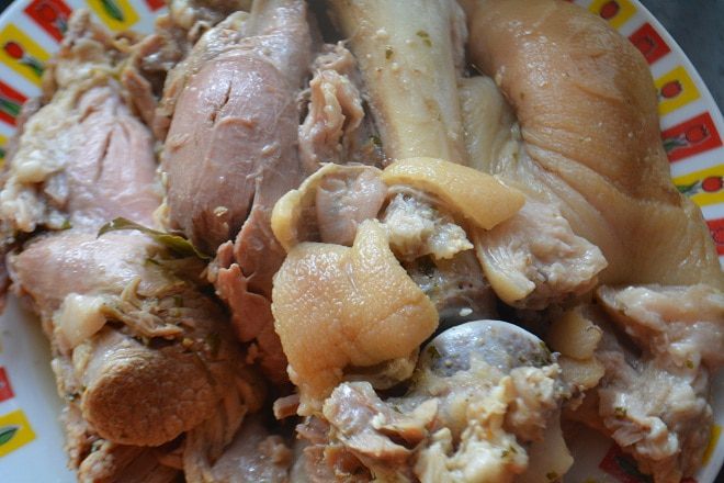 Свиную рульку хорошо промыть. Положить в кастрюлю и залить водой, чтобы полностью покрывало мясо. Варить до готовности 3-4 часа пока мясо не будет отделяться от кости.