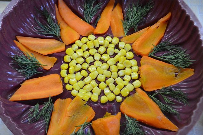 Заранее отварить морковь и нарезать пластинами. На дно формы уложить кукурузу по центру, морковь по размеру лепестков формы и зелень укропа между лепестками.