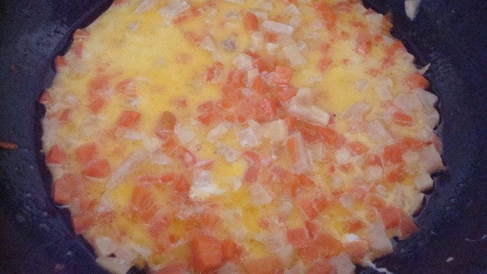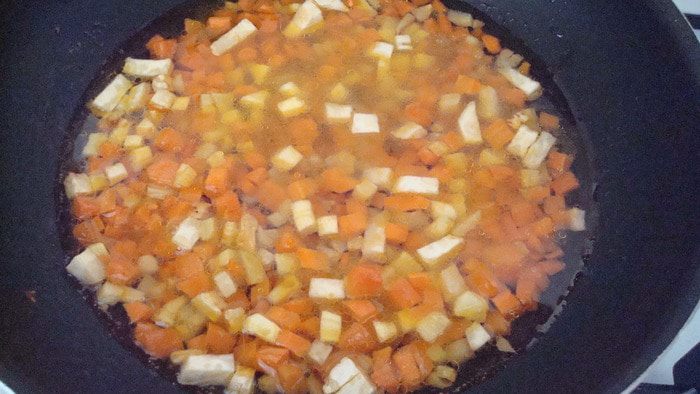 Овощи нарезать и чуть обжарить на оливковом масле, даже не обжарить, а так, слегка потомить.