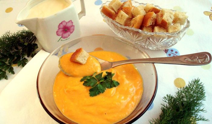Разлить по тарелкам и подавать присыпав зеленью и сухарями с чесноком, но сухари при желании можно исключить:) Суп хорош как горячим, так и холодным. Приятного аппетита!