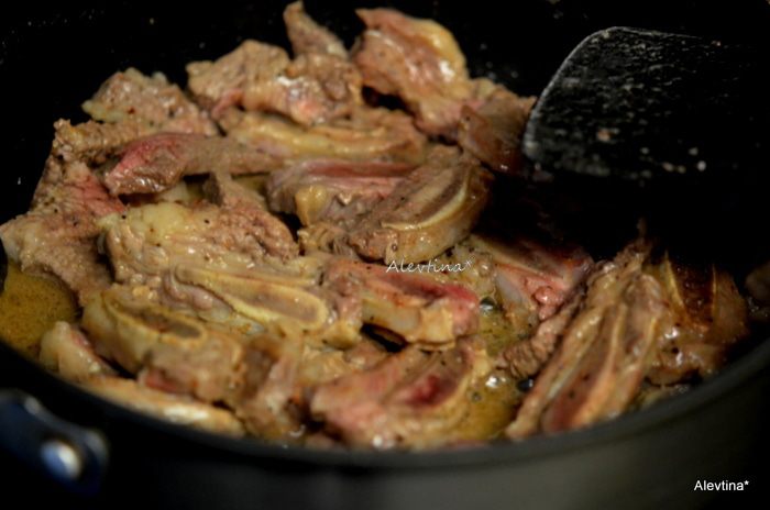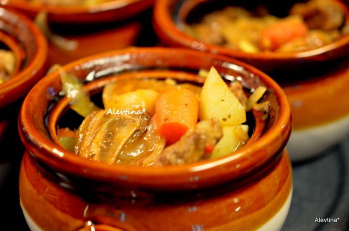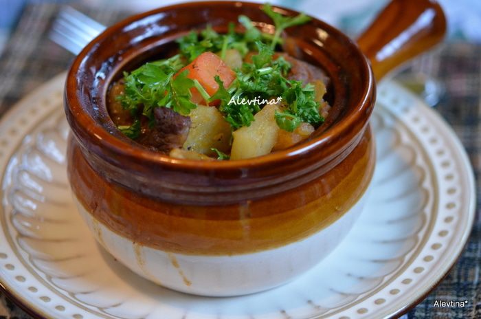 Вкусный ужин на двоих или на семью с кусочками мяса в горшочках. По рецепту идут говяжьи ребра с костью или без, разрезанные на кусочки.
