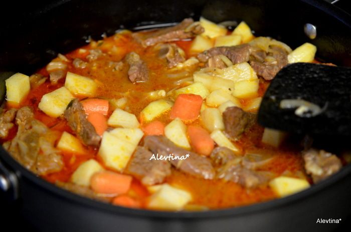 Через пройденный час добавить в общее блюдо, переложить морковь и лук, очищенный и порезанный кубиками картофель. Закрыть крышкой и тушить 30 мин.