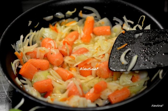 На другой сковороде растопить 30 г сливочного масла. Выложить порезанную крупную луковицу тонко и крупно порезанную морковь. Тушить 15 мин, помешивая.