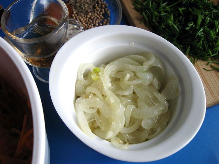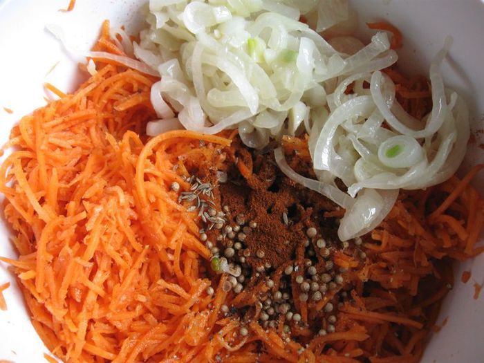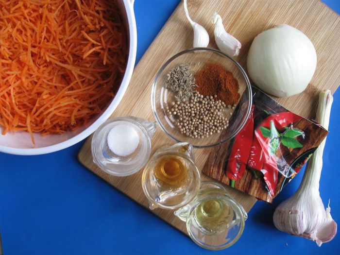 Для этого салата нужна сочная и сладкая морковь, которая является основным ингредиентом. Масло кукурузное, подсолнечное, хлопковое или другое растительное. Уксус можно заменить лимонным соком. Рецепт моркови по-корейски немного изменила по своему вкусу (например, изменила обжарку лука, взяла винный уксус).
