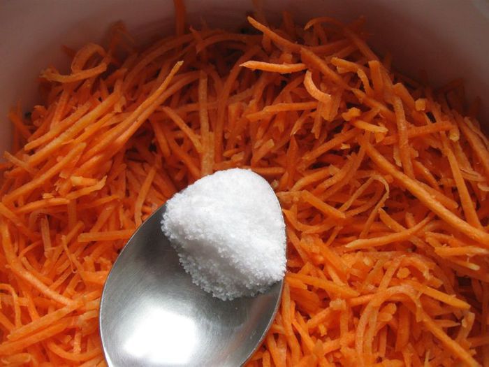 Чтобы нарезать ровной соломкой нужного диаметра и длины морковь, есть три варианта: специальная терка для корейских салатов, можно морковь аккуратно нарезать соломкой вручную или воспользоваться полуфабрикатом (уже нарезанной морковью).