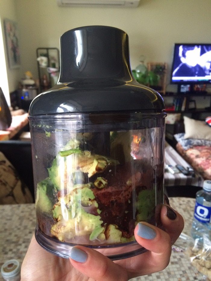 Кокосовое масло (если конечно вы сейчас не в тропиках) в нашем климате твердеет, поэтому его нужно растопить 20 сек в микроволновке. Соли буквально 2-е крупинки для подчеркивания вкуса сиропа. С соевым соусом тоже аккуратно - 1/3 чайной ложки для начала, потом добавите, если что. Складываем всё в блендер. И пробиваем качественно, пару раз останавливаясь и собирая со стенок, взбиваем до однородности - это минуты 3-4.