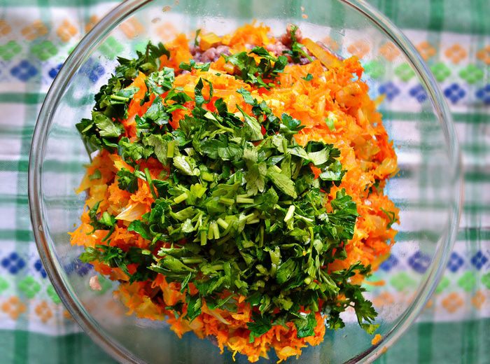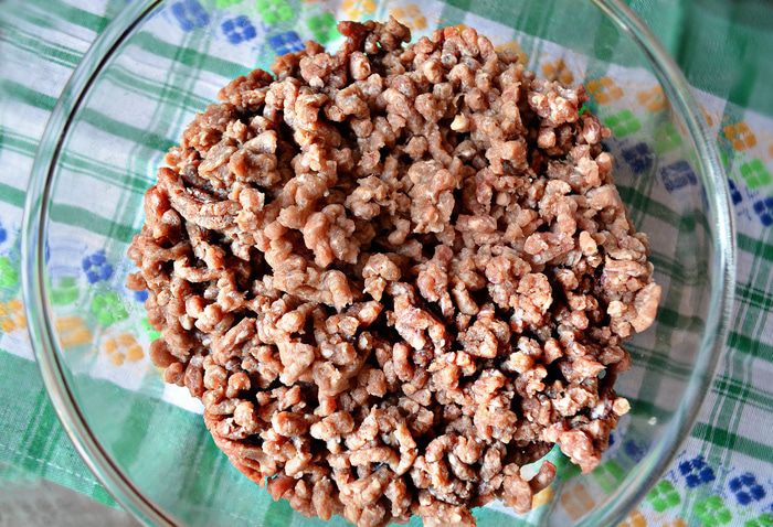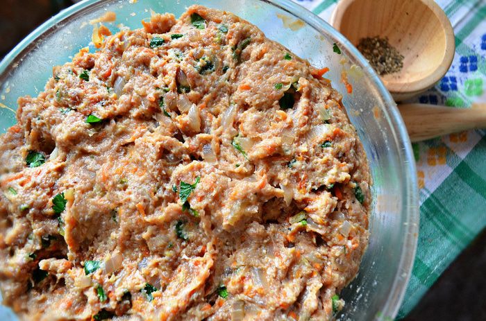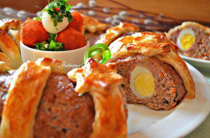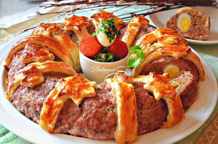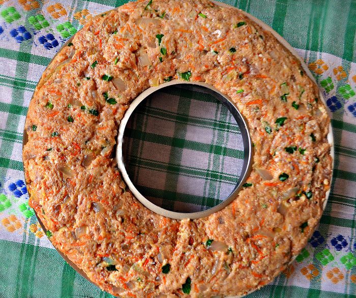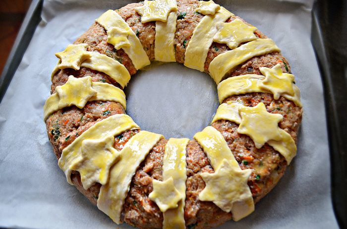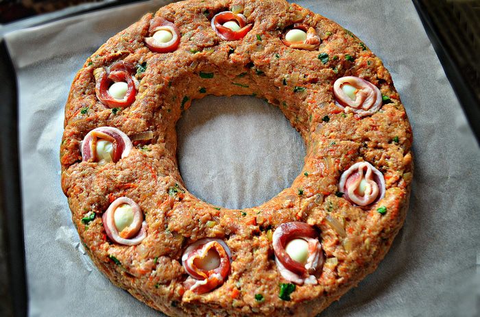 Противень выстелить пекарской бумагой, слегка смазанный растительным маслом. В кольцевую форму (у меня d=28см) слегка утрамбовывая поместите фарш, затем аккуратно переверните на подготовленный противень. Также вы можете сформировать мясное кольцо непосредственно на противне (в центр противня поместите банку и вокруг неё выложите фарш).