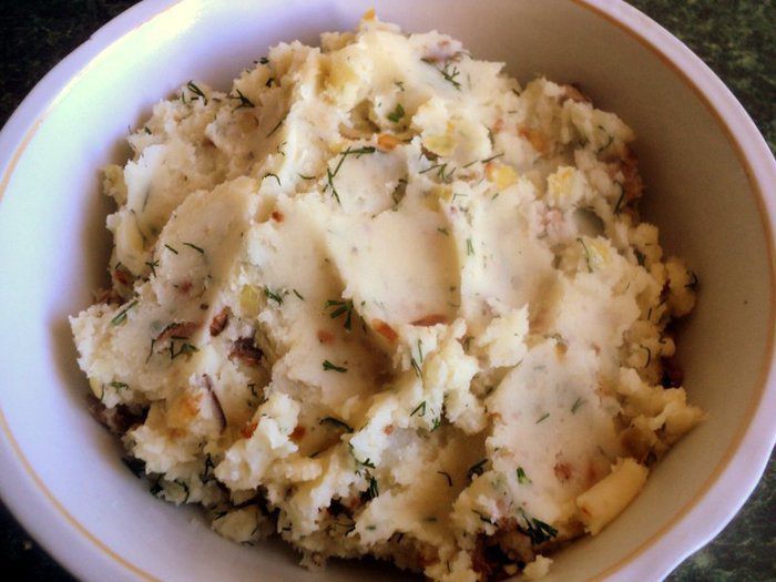 Картофель почистить и отварить до готовности в подсоленной воде. Воду слить, картофель потолочь в пюре, добавить пассированный лук с грибами и мелко порезанный укроп. Добавить перец и кориандр по вкусу, перемешать и охладить.