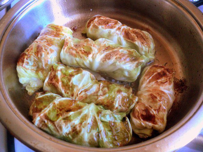 Слегка поджарить голубцы с двух сторон на растительном масле. Переложить голубцы в сотейник.