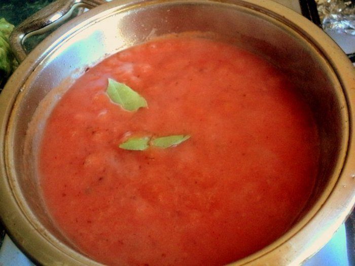 На той же сковородке, в которой жарились голубцы, пассировать муку до золотистого цвета. Затем добавить томатный сок, немного воды, сахар, соль и специи по вкусу.