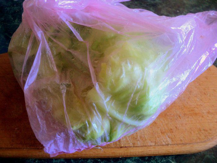 Подготовить капусту. Я обычно вырезаю у капусты кочерыжку, помещаю капусту в целлофановый пакет, завязываю его и в микроволновку на 10-14 минут (в зависимости от плотности капусты) при максимальной мощности. Затем помещаю капусту под холодную воду и разбираю на отдельные листочки, Утолщения у основания листа срезать.