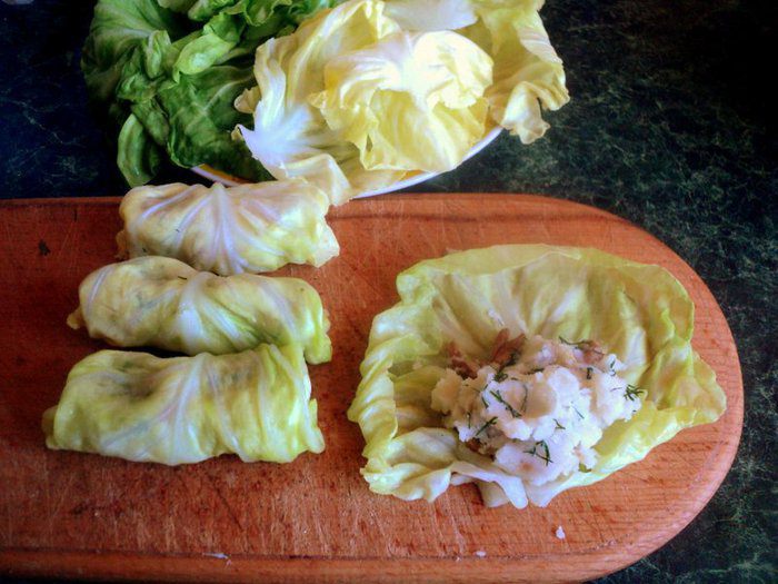 Свернуть голубцы, начинив картофельным пюре.
