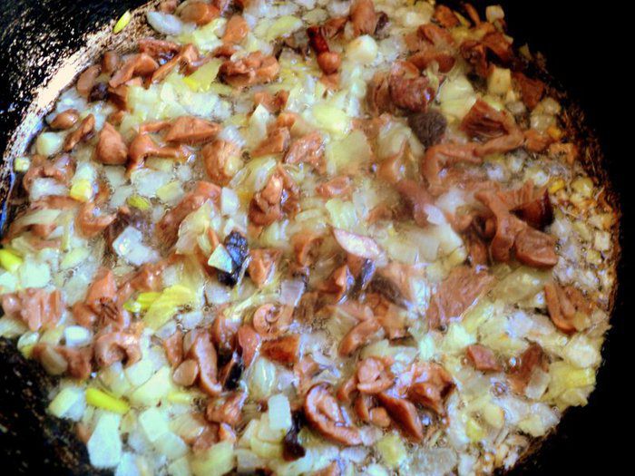 Лук мелко порезать. Грибы (у меня отваренные и замороженные), разморозить, порезать небольшими кусочками. Пассировать лук и грибы на растительном масле.