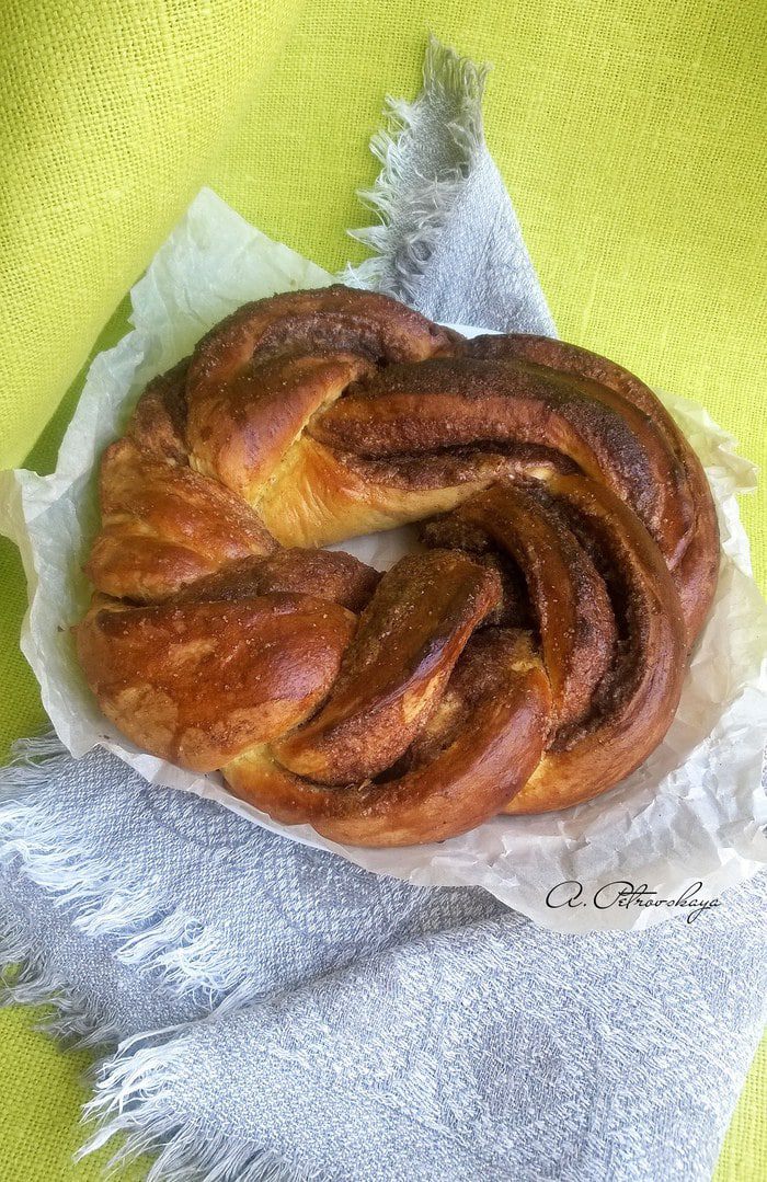 Обомните и раскатайте тесто в прямоугольник с толщиной 0,7 см. Нанесите равномерный слой коричной массы. Начиная с длинного края, сверните тесто в рулет, разрежьте вдоль пополам и переплетите обе части между собой. Сформируйте из плетенки кольцо и очень крепко закрепите края. Прикройте полотенцем и оставьте отдохнуть минут 10.
