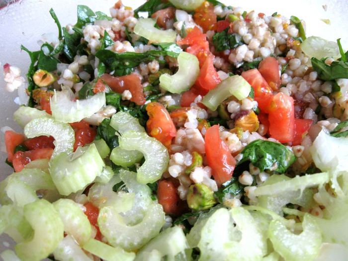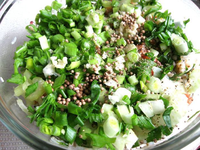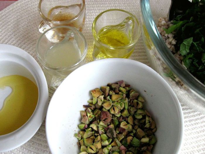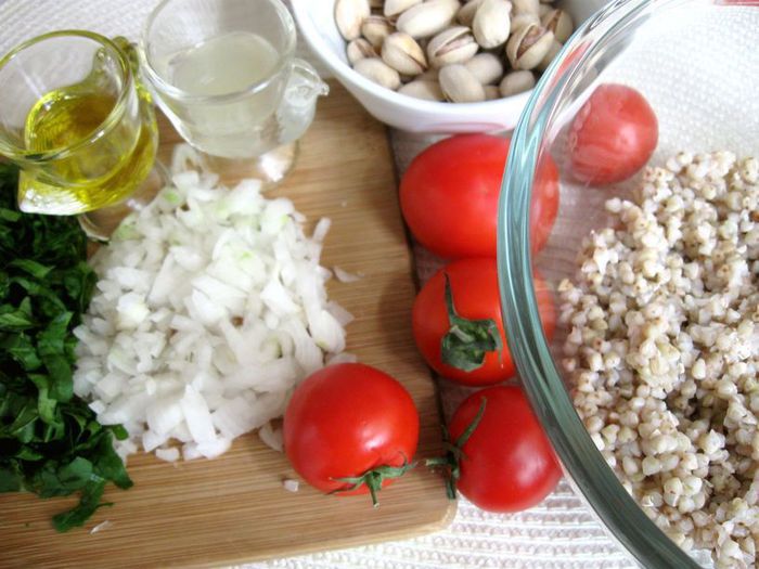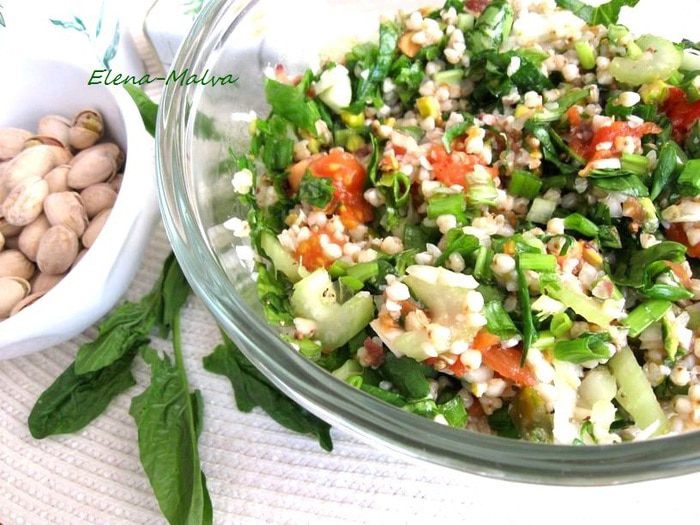Зеленую гречку промыть, поместить в кастрюлю с водой, довести до кипения и варить на умеренном огне до готовности (не разваривать), варить без соли. Откинуть на сито, слегка промыть. Белый лук почистить, нарезать мелкими кубиками. Зелень (шпинат, лук зеленый) помыть, просушить, нарезать мелко. Чеснок выдавить через пресс.