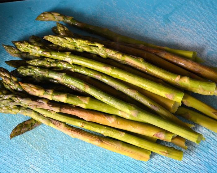 Перед тем как приступить к приготовлению спаржи, следует ее очистить. После этого надо обрезать или отломить примерно два сантиметра от конца стебля. Духовку включить разогреваться на 180 °C.