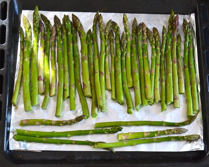 Запекать в разогретой духовке до готовности минут 13-15. Важно следить за спаржей и не пересушить её.