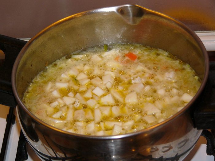 Залить содержимое кастрюли 500 мл кипятка. Добавить сельдерей и поварить под крышкой около 10 минут до готовности овощей.
