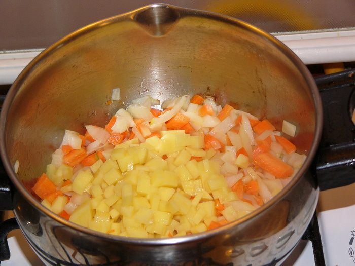 В кастрюле, где будет вариться суп, обжарить на оливковом масле лук, морковь, картофель около 3 минут.