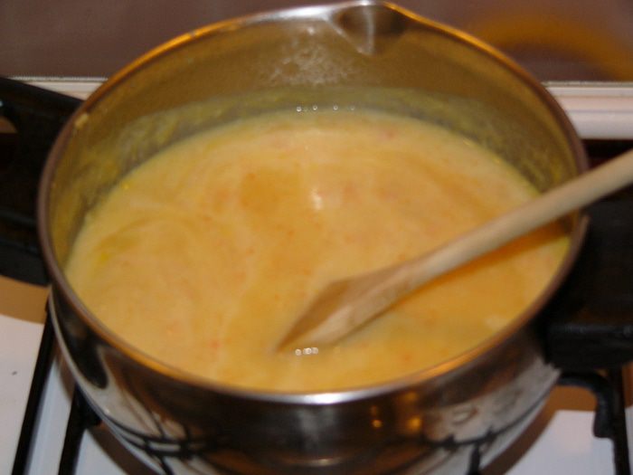 Добавить немного молока, дать закипеть, не забываем про соль и специи. У меня смесь перцев.
