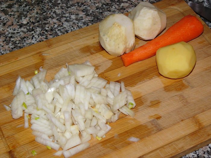 Подготовленные овощи очистить и нарезать мелкими кубиками. Если корень сельдерея вам попался крупный, то достаточно одного.