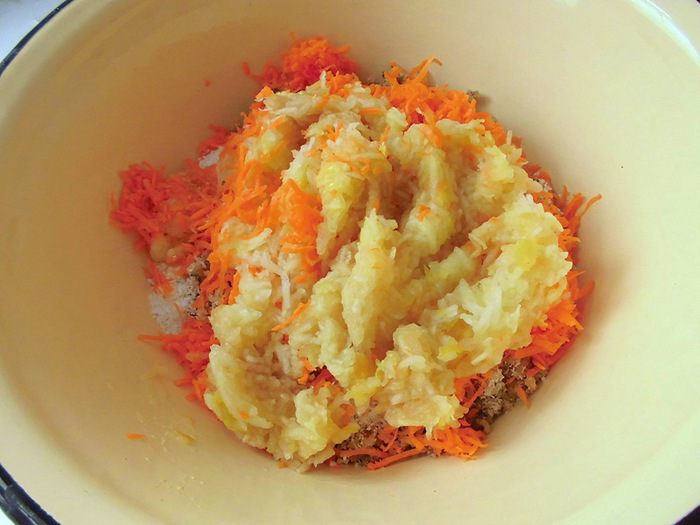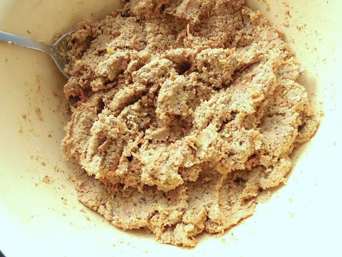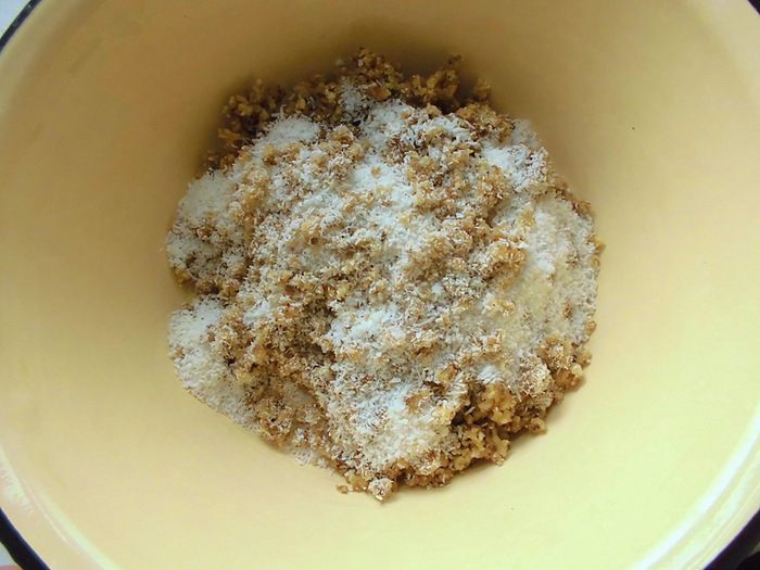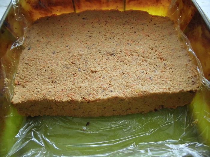 Форму застелить пищевой пленкой и выложить туда подготовленную массу, равномерно распределив ее. У меня не было формы, точно подходящей под размер пирога. Моя была размером 20*20, заполнила я ее где-то на 3/4. Основу убрать в холодильник, пока будет готовиться верхний слой.